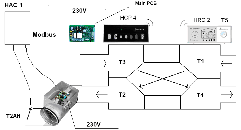 Le contrôle de la batterie se fait via la régulation HAC 1-Dantherm par un signal 0-10V et une sonde de gaine. Le raccordement à la VMC se fait avec le câble plug de 5ml fourni avec la régulation HAC1, qui se branche sous la VMC HCV 5 et à l'arrière du panneau de contrôle HCP 4 qui se déclipse pour les VMC HCH 5 et 8. Ensuite le réglage des températures de chauffage s'effectue avec la télécommande HRC2 qui communique avec la VMC par le panneau de contrôle (schéma de principe ci-desous).