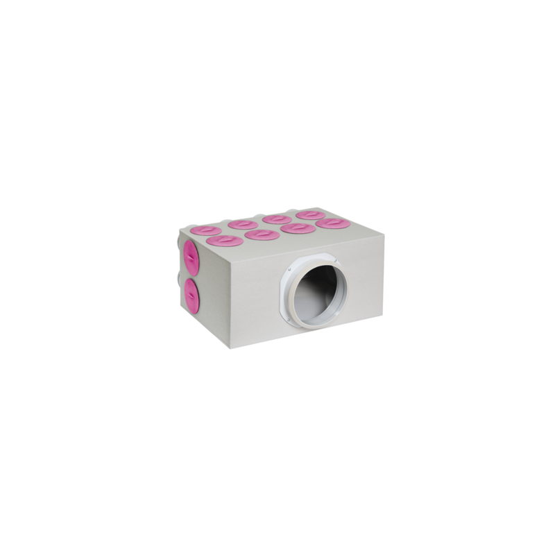 Le caisson Brink possède un revêtement intérieur insonorisant d'une épaisseur de 2cm. L'intérieur du caisson est accessible par une trappe de visite. Le piquage principal est en diamètre 160 / 180mm, il est équipé d'un joint caoutchouc pour une très bonne étanchéité avec le réseau primaire en conduit isolé EPE.