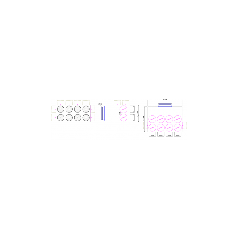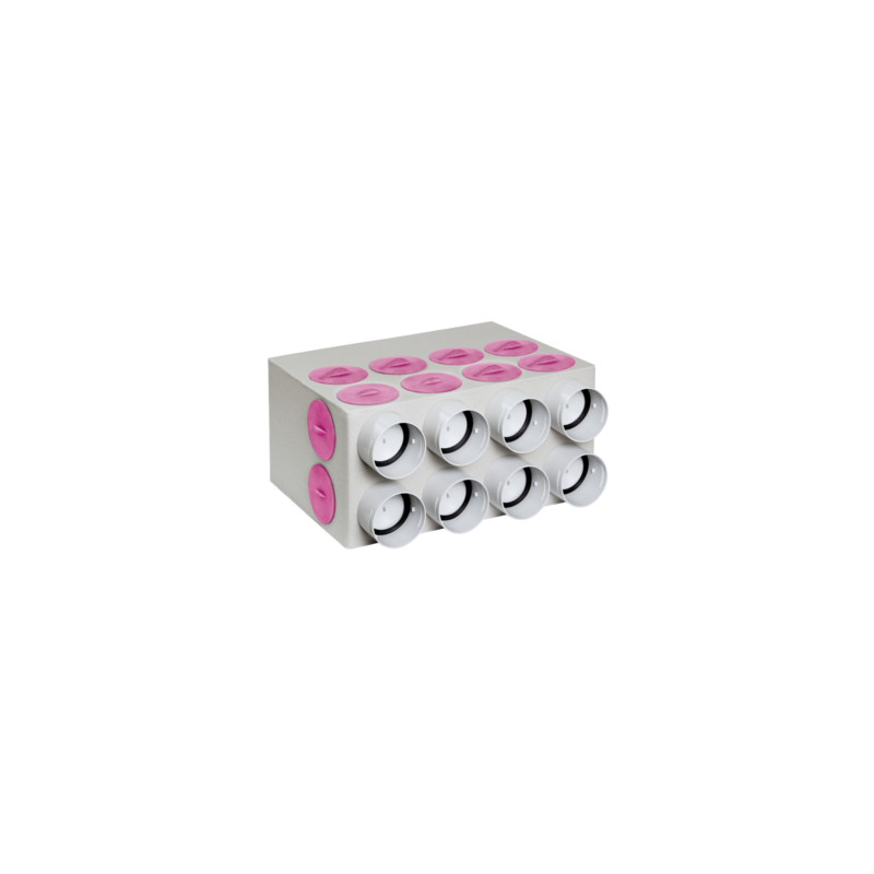 Caisson répartiteur en PVC anti-condensation avec un revêtement intérieur phono-absorbant de 20mm d'épaisseur. Prévu pour le raccordement jusqu'à 8 conduits PEHD DN 90 ou 75 Air excellent Brink. L x l x h = 424 x 308 x 208mm