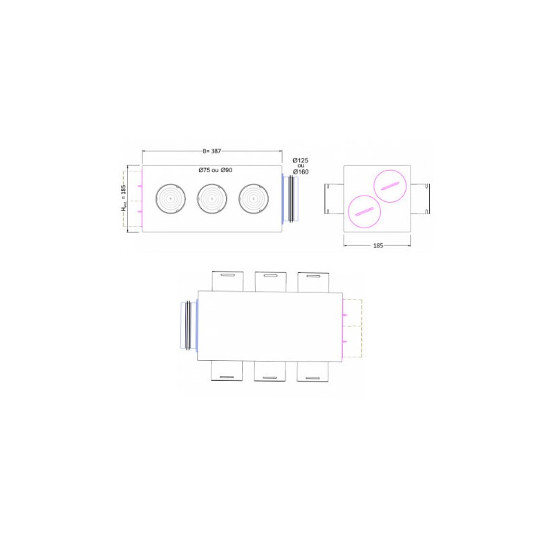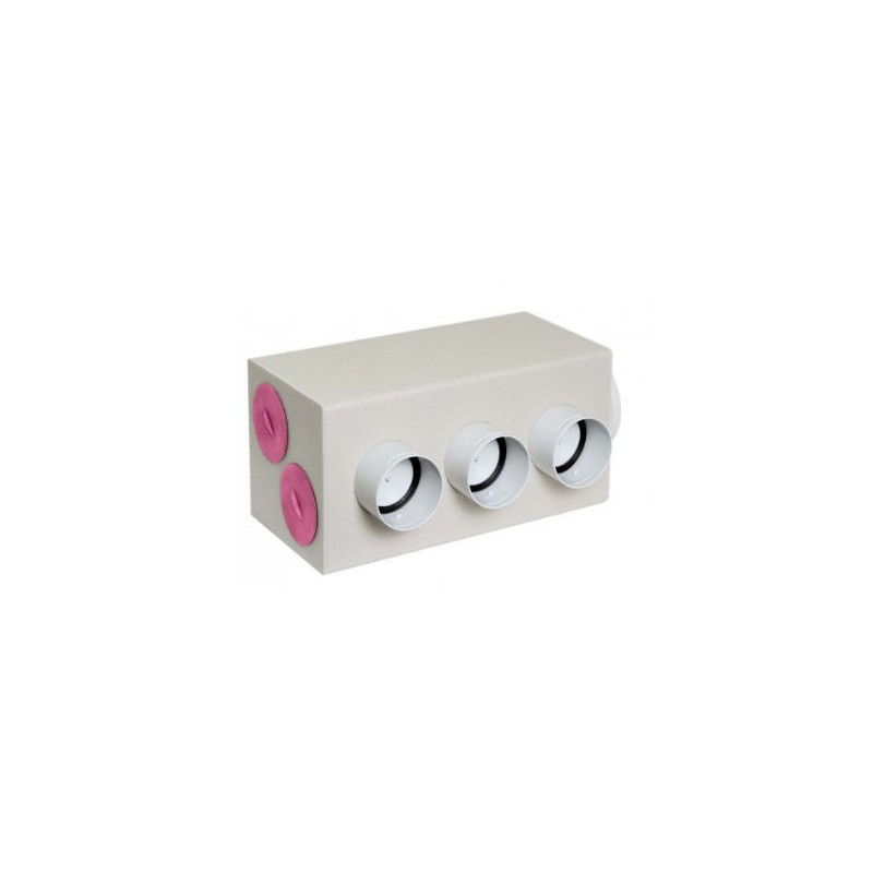 Caisson répartiteur en PVC anti-condensation avec un revêtement intérieur phono-absorbant de 20mm d'épaisseur. Prévu pour le raccordement jusqu'à 6 conduits PEHD DN 90 ou 75 Air excellent Brink. L x l x h = 387 x 185 x 185mm